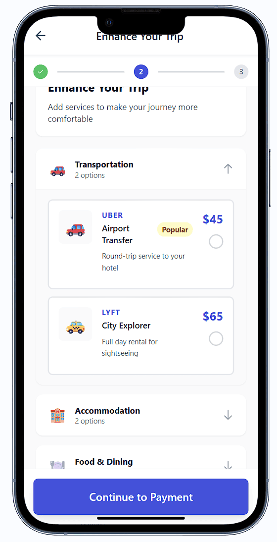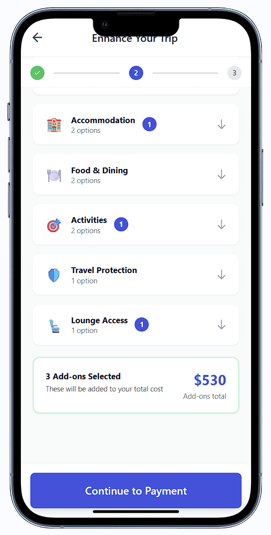 FlexiFly treats checkout as a high-intent moment. Add-ons appear only after users commit to a flight, keeping the core purchase uninterrupted while intent is strongest.